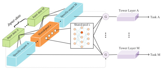 In traditional research [9,13], different tasks utilize identical shared experts. However, it will cause noise for tasks with large differences in relevance. Therefore, we define a shared pool s (), with each <>, where is a set of the task’s index, which is connected with shared pool s, and is the number of tasks that appears in . Then, its shared mean factor is defined as follows: