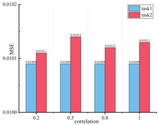 Figure 4 showsshow the lowest MSE value of each task in four distinct task correlation scores, and the performance of the proposed model remains stable beyond expectation as the task correlation decreases. In particular, changes in task relevance have no harmful impact in task 1; although the MSE value in task 2 achieved a slight increase when task correlation score faced 0.5, it also reduced to the lowest value of 0.2 in the correlation score. It is worth noting that this experiment is taken up with different model sparsity, which means that the selected lowest MSE value of two tasks comes from dissimilar trained task subnets. We discuss the performance of task relatedness under unequal subnet sparsity in the next section.