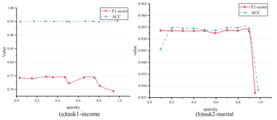 Table 3 shows the shared pool sparsity of the task subnet when the F1-score and accuracy of each task reaches the optimal value. For the income task, the sparsity of the highest F1 value is different from that when the ACC value is optimal. After comparing the experimental data, we find that when the F1 value is optimal, the difference between the ACC value and the optimal ACC value under the same sparsity is only 0.001; the same error also exists in the F1 value under the optimal sparsity of ACC.
