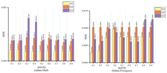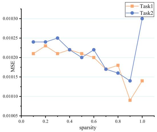 In the same way, PBFS’s MSE value in two tasks of synthetic data is verified with different sparsity under the 0.5 correlation score. According to Figure 8, the task’s MSE reaches the lowest value when the pruning rate is 0.9, but it will rebound obviously when all parameters are cut off, which proved that there might be too many redundant parameters existing in the model. Additionally, the importance of sharing some public information between tasks also provides evidence that the proposed model can improve the prediction accuracy.