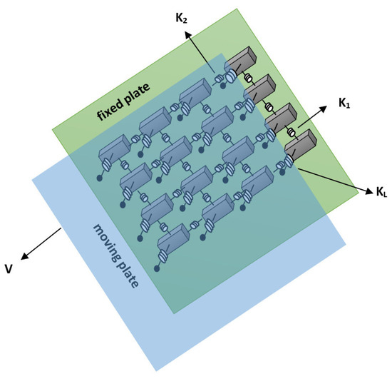 The OFC spring-block model is a two-dimensional dynamic model. Each block is connected to four blocks by springs; below, there is a fixed plate (green), and at the top, it is attached to a movable plate (blue).