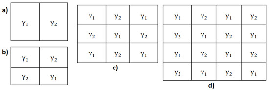 Distribution of the regions in the spring-block matrix: (a) 1 × 2 regions, (b) 2 × 2 regions, (c) 3 × 3 regions, and (d) 4 × 4 regions. In all cases and .