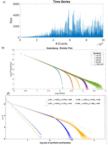 We take the size of a synthetic earthquake as the number n of relaxed blocks and use the definition of [43], where magnitude is a function of n; for example, , and r is a convenient base of the logarithm.