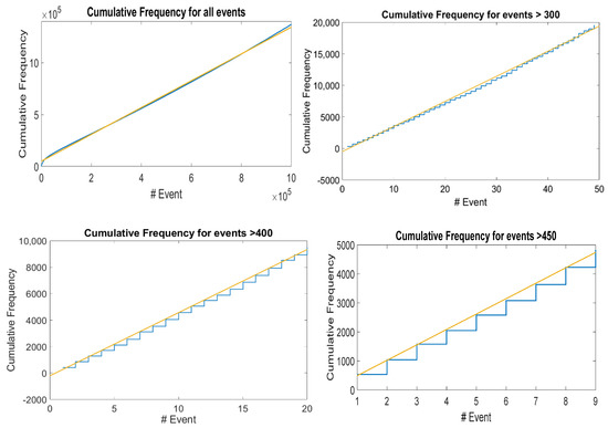 The ladder graphs and the behavior that has been described are also obtained for the accumulated synthetic eQs. (top, left) Cumulative Frequency of all eQs produced by the spring-block simulation; (top, right) Cumulative Frequency for eQs bigger than 300 relaxed blocks; (bottom, left) Cumulative Frequency for eQs bigger than 400 relaxed blocks; (bottom, right) Cumulative Frequency for eQs bigger than 450 relaxed blocks. In all cases, values of γ = 0.2 and L = 200 were used. The continuous line represents the historic slope to which they are attracted.