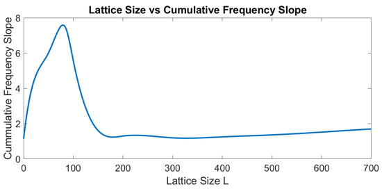 Variation of the slope of the cumulative frequency of earthquakes according to the size of the lattice for γ = 0.2. For lattice size < 100, the slope is growing to a maximum value; then, it decreases up to lattice value of 150, and finally, it shows constant growth alongside the lattice’s growth.