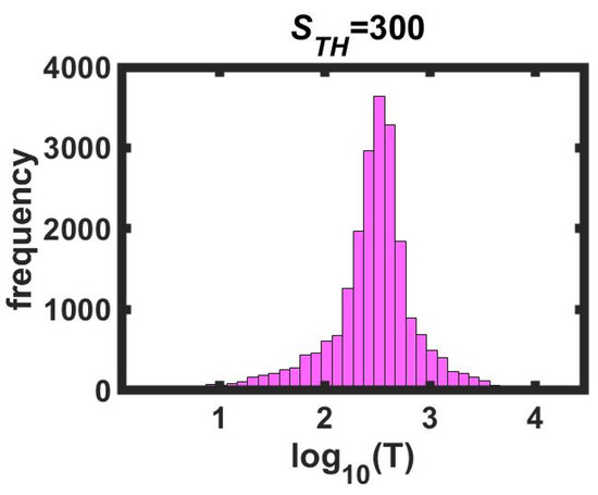 Histogram for the logarithm of recurrence times of synthetic earthquakes of great magnitude, γ = 0.2, L = 50 data. In the largest earthquake’s size (SMax), 1659 blocks were relaxed. In this case, we arbitrarily chose to eliminate all the earthquakes with sizes less than the threshold size STH = 300 relaxed blocks. We conserved only 36,230 synthetic earthquakes and calculated the recurrence times. In this case, we have a recurrence time series with 36,230 data points.