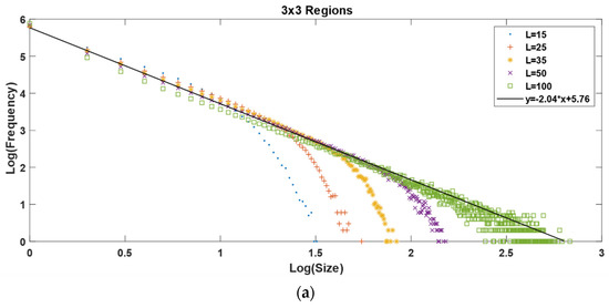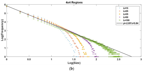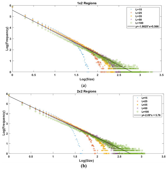 It is possible to see that when we increase the number of regions, the maximum value of the synthetic earthquake’s size diminishes. The increase in the number of regions goes as follows: one region for the homogeneous matrix and 2, 4, 9, and 16 regions for the 2 × 2, 3 × 3, and 4 × 4 non-homogeneous matrices, respectively. As we can see in Figure 3, the maximum value for the x axis, which is also the maximum value for the earthquake’s size in a log-log plot, is ≈3.8; then, when we increase the number of regions to 2, 4, 9 and 16, we obtain a maximum value for the earthquake’s size of 3.3, 3.1, 2.8, and 2.6, respectively, as shown in Figure 7 and Figure 8.