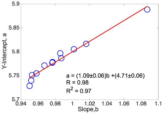 As mentioned, the first of the results found in the use of the spring-block model applied to the seismic phenomenon refers to the positive correlation between variables a and b of the Gutenberg-Richter frequency–magnitude relationship, a result published in reference [42]. This work started from the positive correlation found from the data reported by Bayrak et al. in 2002 [69]. These authors investigated 27 active seismic zones around the world, reporting, among other information, the a and b values of the linear fits of the Gutenberg-Richter relationship (a, b) made for each of the seismic zones under consideration. In a simple evaluation, , and the Pearson correlation of these 27 values was calculated, finding a significant positive correlation (, i.e., ), with a confidence level of 0.05 [42].