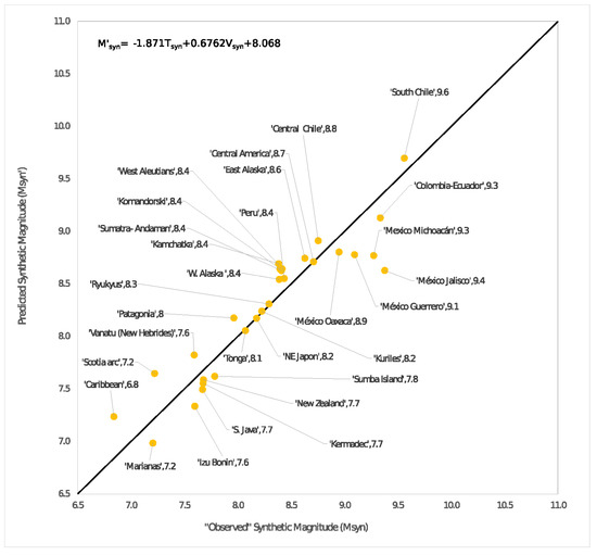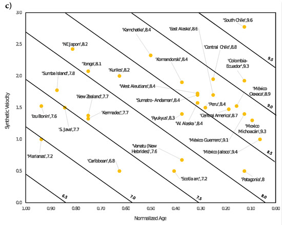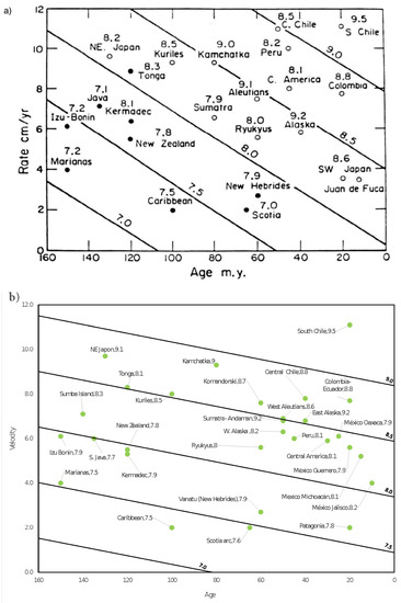 Taking into consideration that Ruff and Kanamori [45] described different types of coupling between the descending and upper plates, we proposed a case with different K values: and substituting in the definition (Equations (6) and (7)), , and then setting , which leads to . In the plane , this Equation represents a straight line with a negative slope, where can take values between [0, 0.25], while is in the interval [0, 1]. In addition, we have some evidence obtained from sandpaper experiments [43,46] where there is a relationship between and the age of the weathered surfaces. Considering the interval from 0 to 160 Myr proposed by Ruff and Kanamori [45], we defined as the normalized age of the tectonic plates. Assuming that for the maximum value of the tectonic age (160 Myr) it corresponds to the value of 1, it is possible to propose that to obtain the following equation: