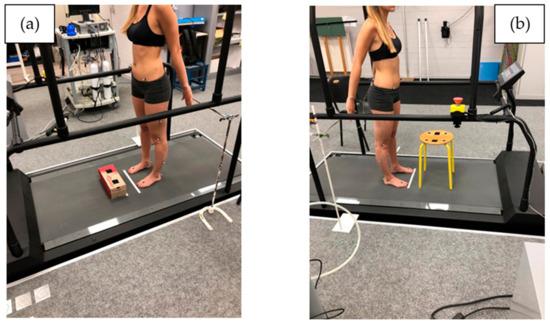 (a) Starting position for b and r box test; (b) starting position for b and r stool test. Box and stool are placed 10 cm in front of the participant’s toe marker.