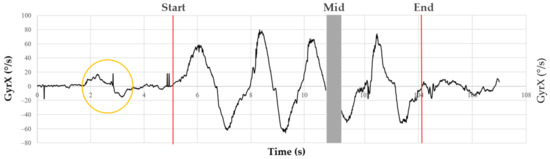 Typical trace of GyrX versus time during b and r movements (4 cycles are displayed). The yellow circle shows the left–right rotation asked before beginning the b and r movements. The first red line shows the closest point to 0 just before the start of the first b and r cycle, and the second red line shows the closest point to 0 just after the last b and r cycle, as it can be easily seen.