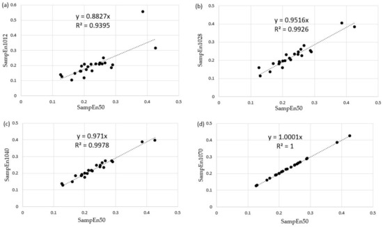 Typical linear regressions for SampEn50 vs. SampEn10I computed for GyrX in the b and r stool test; the regression was performed on the 23 participants (black points). (a) SampEn50 vs. SampEn1012. (b) SampEn50 vs. SampEn1028. (c) SampEn50 vs. SampEn1040. (d) SampEn50 vs. SampEn1070.