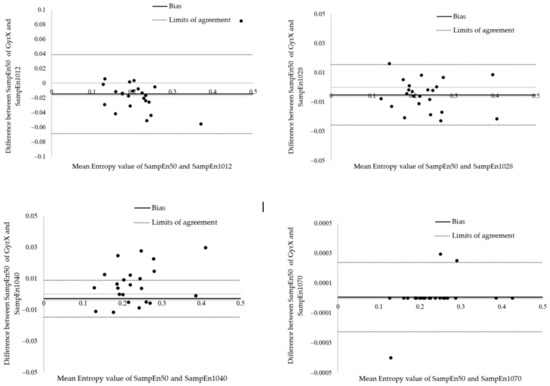 The duration of a clinical test involving repeated movements should not be too long, to obtain and maintain patient compliance. As shown above, a 70 s measurement including a 10 s habituation phase and a 60 s actual test phase yields SampEn values for the three-axis accelerometer and three-axis gyroscope that are almost perfectly equivalent to those that would have been measured over 50 repetitions in the b and r test (R2 and slope equal to 1 up to software precision). However, satisfactory SampEn values (R2 = 0.99926 and slope of 0.9516) were already obtained after 18 s of testing. The Bland and Altman analysis shown in Figure 7 reveal that the mean bias between SampEn50 and SampEn1028 was −0.0052 ± 0.0105 with 95% limits of agreement of the bias from −0.0259 to 0.0154. These results suggest a great agreement between the SampEn50 and SampEn1028 values. For future research, a measurement over 60 s with a 10 s warm-up should be considered, although measurements over 20 s are already satisfactory in daily practice.