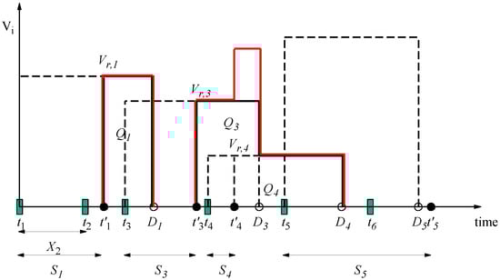 We illustrate the evolution of value with an example. In Figure 2 and Figure 3, the evolution of value for specific packets generated over time is shown in an M/GI/1/1 system with constant value and linearly descending values, respectively. We use to denote the inter-arrival period between two packets and i. Therefore, is an exponentially distributed random variable with rate parameter . Packet 1 finds the server idle and begins service at ; service ends at . Packet 2 arrives between and , and it is discarded. The service of packet 1 finishes at before the deadline of packet 1, . The value of packet 1 at , when received by the receiver, is non-zero, and it becomes zero at . Packets 3, 4 and 5 arrive to the system during the idle period, and they are received at , and . Note that when packet 4 is received, packet 3 has a non-zero value; thus, the sum VoI, which is shown with a solid red line, is the sum of the values of these packets.