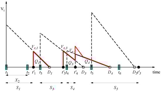 We define areas under the rectangular regions of the curve shown in Figure 2 or the triangular regions of the curve shown in Figure 3, and we set for packets discarded in the queuing phase. Then, the expected sum VoI at the receiver is as follows: