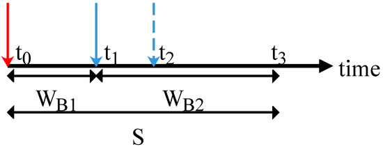 Since only the first packet that arrives during the busy period is served and the others are discarded, we introduce a lemma for the probability that an arriving packet is the first one that arrives in the busy state. To do so, we first define states and as the busy states of the server with zero and one packet waiting in the queue, respectively. The renewal cycle is as follows. After the idle period, an arrival happens and the system turns to state. Now, a time duration of service S starts and if during the service period another arrival occurs, the system turns to state. This back-and-forth between and states continues until no packet arrives in one service time. We provide an example in Figure 4 for the three states in the M/GI/1/2 scheme. At time , packet 1 arrives and finds the system idle. Packet 2 finds the system in state at and is stored in the buffer. Packet 3 finds the system in state at and is dropped.