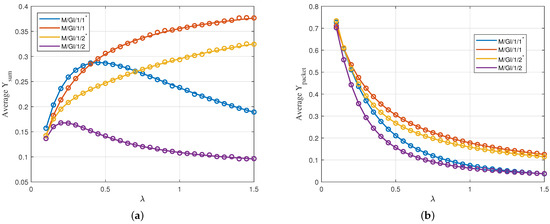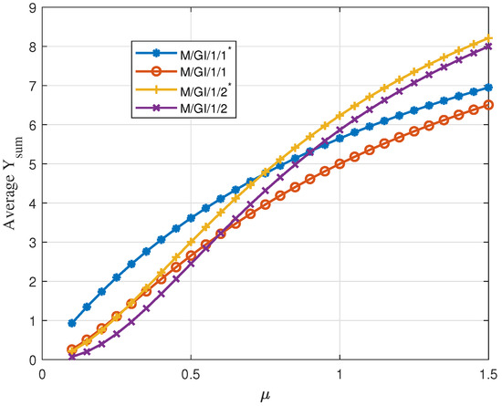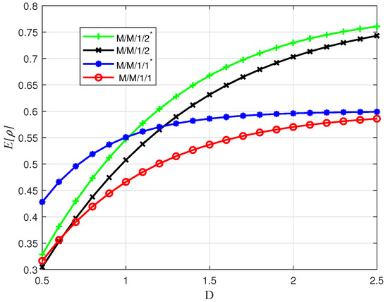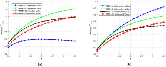 Average for exponentially distributed service time with constant value versus for M/M/1/1, M/M/1/2, M/M/1/2* and M/M/1/1* schemes with and . (a) Dependent Value. (b) Independent Value.