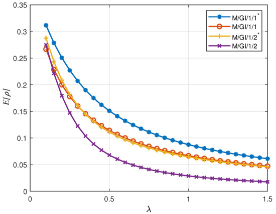 Finally, in Figure 8, we show the average versus service rate for the four queuing schemes when the service times are independent of the initial values and are exponentially distributed. We observe that M/GI/1/2 and M/G/1/2* perform better than M/GI/1/1* as increases. This is because, as the average service time deceases, fewer packets will expire, i.e., reach ultimate staleness, during the waiting period in the buffer, and in this case, having a buffer to store the packets turns out to yield larger value at the receiver with respect to dropping the packets in the server.