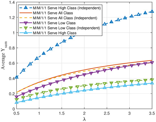 In Figure 11, we set , and . We compare plots showing average versus for three different service policies in an M/M/1/1 system. The first policy serves all packets without regard to the value, the second policy involves serving only class 1 packets, and the third policy serves only class 2 packets. Note that if the service time is dependent on the value, class 1 packets will have exponentially distributed service time with mean , and similarly, class 2 packets will have exponentially distributed service time with mean . If the service time is independent of the value, both class packets will have exponentially distributed service time with . Our numerical results show that when service time is independent of value, always serving the high-value packet will yield the highest average value. On the other hand, in the dependent case when arrival rate becomes large, serving the packet with low value but smaller service time and high probability will benefit the average compared to serving all the packets or serving the high-value packets with larger service time and low probability.