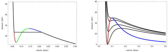 At the points in the part of the original isotherm curve between the minimum and the maximum, called the instability branch of the isotherm, the compressibility is negative, since (see the green part of the isotherm in the left panel of Figure 1). The locus of the minimum and maximum points of the sub-critical isotherms in the plane V–P is called the spinodal curve: the minimum and the maximum points form, respectively, the liquid and the vapor branches of the curve (red and blue curves in the right panel of Figure 1). All the points below the spinodal curve cannot represent equilibrium states of the real gas since they follow on the instability branch of one of the van der Waals isotherms and, thus, are mechanically unstable since they would have negative compressibility. Indeed, if a real gas is prepared in one of those states, the liquid and the vapor phase quickly separate through a mechanism called spinodal decomposition. On the other hand, if the real gas is prepared in states above the spinodal curve not belonging to the pure phase branches of the Maxwell isotherms, under particular experimental conditions, it is possible to observe metastable states, such as super-saturated vapor and super-heated liquid. It is thus rather natural to interpret those points (respectively, the red and the blue arcs in the left panel of Figure 1) of the van der Walls isotherms as metastable states.