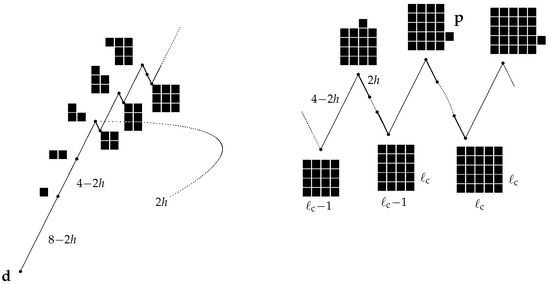 When a plus protuberance is added to the side of the plus rectangle (or square) of length ℓ, the energy increases by ; on the other hand, when this very side is filled by pluses, the energy decreases by . The energy difference related to the process of adding a side is equal to , which is positive provided , where , where, for any real number a, is its integer part, i.e., the largest integer smaller than a. Thus, the optimal path achieves its maximal energy at configuration (see Figure 4) made of a rectangle of pluses with a unit protuberance on one of its longest sides. The communication height between and is