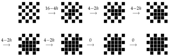 The optimal path connecting to is constructed—see also (Section 5.2, case A–A in [43])—by letting the spins perform a flip-flop at each time, except for some pluses that are kept fixed in such a way to eventually invade the whole lattice (see Figure 5): at the first step, two arbitrary next-to-the-nearest pluses (Euclidean distance ) are kept fixed so that a two by two plus square is formed in the chessboard sea. At the second step, the pluses in the square and a plus adjacent to the square are kept fixed in order to form a two by three rectangle. At the third step, the pluses in the rectangle are kept fixed together with the plus at the center of one chessboard side adjacent to the longest side of the rectangle. In this way, a three by three plus rectangle is formed. Before taking the fourth step, the chessboard sea is allowed to flip-flop, if necessary, so that a plus appears at the site in the center of one of the chessboard sides adjacent to the plus square, thus such a spin is kept fixed and a three times four rectangle is formed. In the fifth step, one of the pluses adjacent to the longest side of the plus rectangle is kept fixed, and a double or triple plus protuberance is formed on such a side. In the following steps, this protuberance is kept fixed together with the plus in the three by four rectangle till the four by four plus rectangle is formed. This path is then followed, alternating plus squares and plus rectangles alike, whose side lengths differ by one.