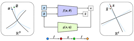 One issue with this one-sided LDR learning (4) is that maximizing the above objective (5) tends to expand the dimension of the learned subspace for features in each class (if the dimension of the feature space d is too high, maximizing the rate reduction may over-estimate the dimension of each class. Hence, to learn a good representation, one needs to pre-select a proper dimension for the feature space, as achieved in the experiments in [13]. In fact the same “model selection” problem persists even in the simplest single-subspace case, which is the classic PCA [48]. Selecting the correct number of principal components in a heterogeneous noisy situation remains an active research topic [49]). To verify whether the learned features are neither over-estimating nor under-estimating the data structure, we may consider learning a decoder from the representation back to the data space : , and check how close and are or how close their features and are. In principle, the decoder g should examine if all the learned features by the encoder f are both necessary and sufficient for achieving this task. The overall pipeline can be illustrated by the following “closed-loop” diagram: