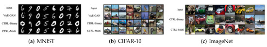 Comparison (IS and FID) with other formulations. First, we conduct five experiments to fairly compare our formulation with GAN [63] and VAE(-GAN) [64] on MNIST and CIFAR-10. Except for the objective function, everything else is exactly the same for all methods (e.g., networks, training data, optimization method). These experiments are: (1). GAN; (2). GAN with its objective replaced by that of the CTRL-Binary (13); (3). VAE-GAN; (4). Binary CTRL (13); and (5). Multi-class CTRL (12). Some visual comparison is given in Figure 3. IS [65] and FID [66] scores are summarized in Table 1. Here, for simplicity, we have chosen a uniform feature dimension for all datasets. If we choose a higher feature dimension, say , for the more complex CIFAR-10 dataset, the visual quality can be further improved, see Table A14 in Appendix A.11.