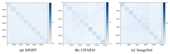 Visualizing correlation of features and decoded features . We visualize the cosine similarity between and learned from the multi-class objective (12) on MNIST, CIFAR-10 and ImageNet (10 classes), which indicates how close is from . Results in Figure 4 show that and are aligned very well within each class. The block-diagonal patterns for MNIST are sharper than those for CIFAR-10 and ImageNet, as images in CIFAR-10 and ImageNet have more diverse visual appearances.