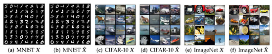 - Rosca, M.; Lakshminarayanan, B.; Warde-Farley, D.; Mohamed, S. Variational Approaches for Auto-Encoding Generative Adversarial Networks. arXiv 2017, arXiv:1706.04987. [Google Scholar]