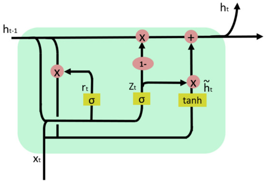 The update gate determines how much information will be transmitted to the next time step. The model can copy all previous information, which reduces the risk of vanishing gradient. At the time step t, Equation (2) is used to calculate the gated signal at the update gate: