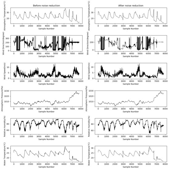 After denoising, a dataset consisting of 7803 × 11 pieces of data was obtained, and the data of specific features were denoised by the corresponding optimal wavelet function, as mentioned above. Figure 3 shows the denoising results of data of the first six features (atmospheric temperature, wind direction, wind speed, atmospheric pressure, relative humidity, and water temperature). The figures on the left present the distribution of samples before denoising, and the figures on the right show the distribution of samples after denoising.