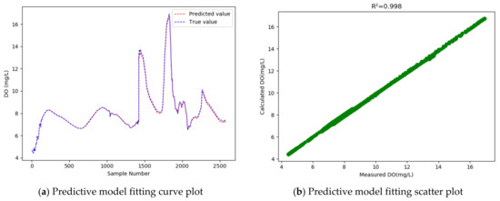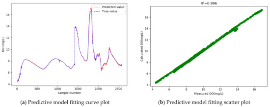 In our experiment, 33% of the samples were used as the test set to test the models, and then a curve line was drawn, according to the predicted value and the actual value of the test sample data, where the abscissa represents the serial number of the test sample point, and the ordinate represents the dissolved oxygen concentration value. Figure 5, Figure 6, Figure 7 and Figure 8 show the fitted curve of the predicted value and the actual value of each model, and the relationship between these two values.