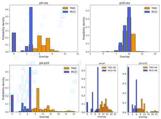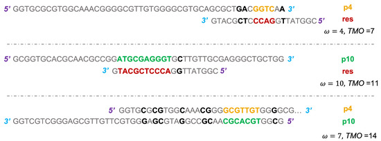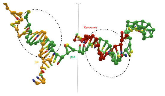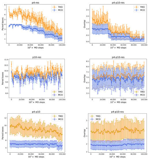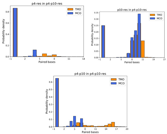 - The actual MCO between p10 and the resource is equal to for more than 50% of the timesteps (see top right panel of Figure 4), and it is equal to for more than 30% of the cases. Here, it is also evident that the TMO does not play a key role, compared to the MCO, since they have very similar distribution, with TMO usually being larger at most by 1 or 2. MD simulations with oxDNA suggest, thus, that the MCO onset, maybe with one additional HB formed, is the preferred way for these strands to interact. This result can be interpreted as a much stronger binding than the p4-res case.