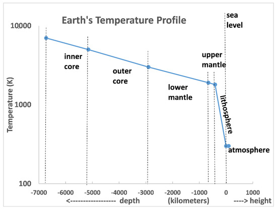 Mean temperature profile of the Earth and its atmosphere; the average temperature of the atmosphere is around 300 K: the average gradient <dT/dz> for the lithosphere is around –5 K/km, i.e., slightly less than the troposphere average up to the tropopause at 10 km (Figure 1): the atmosphere outer limit is 100 km.