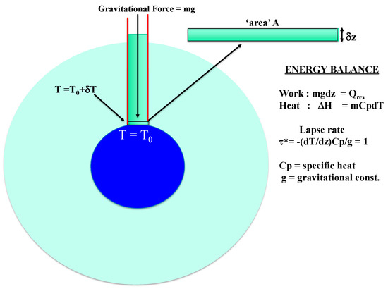 Schematic 2D illustration of an energy balance for a hypothetical reversible adiabatic expansion process for an infinitesimal expansion of a column volume element of the Earth’s atmosphere, initially at equilibrium at temperature T, by an amount Adz (=dV) at the local gravitational pressure p(z): the hypothetical expansion in isolated closed system indicated by red lines in equilibrium with T0 at ground zero with no roof under gravity would predict a non-equilibrium constant gradient in temperature (dT/dZ) known in climate modelling as the “dry adiabatic lapse rate” (DALR) = –9.8 K/km [7,8,9].