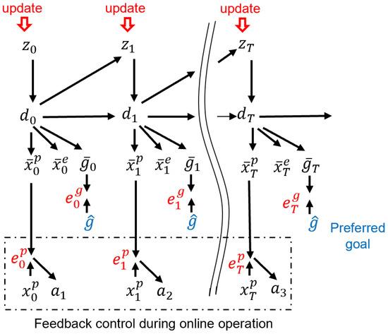 Brain-inspired models for goal-directed action have been developed in various forms. Most brain-inspired models are based on forward models [4,5,6] for predicting sensory outcomes of an action to be executed. For goals given in terms of a preferred sensory state at the distal (terminal) step, optimal action sequences leading to the goal under assumed constraints, such as a minimal torque change criterion, can be obtained inversely using the forward model. Recently, Friston and colleagues [7,8] advanced the idea of goal-directed action using a forward model by incorporating a Bayesian perspective. Goal-directed planning for achieving the preferred sensory states is formulated under the framework of active inference [9,10,11] based on the free energy principle [12].