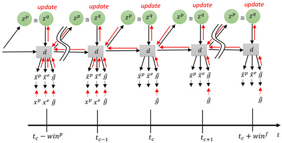 A key difference between our newly proposed model, T-GLean, and our previous model, GLean, is the idea that the goal expectation is generated at every time step instead of expecting the goal sensory state at the distal time step. Intuitively, this means that at every time step, the agent expects a goal state that the on-going action sequence will achieve. An advantage of this model scheme is that goals can be represented not only by distal sensory states to be achieved, but also by continuously changing sensory sequences. Another key feature of T-GLean is that the model generates plans online, in real-time, while the agent is acting on the environment, whereas our prior study using GLean showed only an offline plan generation scheme. In T-GLean the network maintains the observed sensory sequence in a past window while allocating a future window for the future time steps. In the past window, evidence free energy is minimized online by updating the posterior at each time step in order to situate all the latent variables to the observed sensory sequence. In the future window, the error between the preferred goal and the expected goal output is minimized for all steps by updating the posterior predictive distribution in the window iteratively, of which computation can be performed by minimizing the expected free energy. The future plan for achieving the preferred goals can be generated once the evidence free energy in the past window is minimized, i.e., the latent variables are well situated to the past sensory observation. This scheme is referred to as online error regression [16] and analogous models can be seen also in [8,31]. The scheme is shown graphically in Figure 5.
