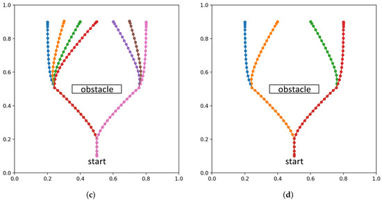 In each test, the simulated agent is in a square workspace with coordinates in the range of for both x and y. The agent always starts at position . In the center of the workspace is a fixed obstacle of size . The agent does not directly sense the workspace coordinates. Instead it observes a relative bearing and distance to a fixed reference point at as exteroception. In this experiment, the agent only receives exteroception without proprioception. The simulated agent controller handles conversion to and from the workspace coordinates to relative bearing-distance as the robot moves. This is computed as and . Note that the agent is not trained to sense or avoid the obstacle. Rather the trained agent attempts to follow its trained paths around the obstacle as habituated actions.