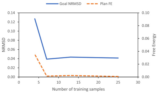 To evaluate goal position generalization, we considered the difference between the final agent position reached at the end of plan execution and the preferred goal at the end for each test trial, as well as the plan free energy that remained. The difference between agent position and goal is expressed as the root-mean-square deviation, normalized to the range of (NRMSD). We also consider the plan free energy at the point where the agent reaches the final position, following Equation (12). Figure 8 plots goal NRMSD and the mean plan free energy (plan FE) as the number of trained goals is changed. Plan FE is obtained by averaging over the length of the planning window.