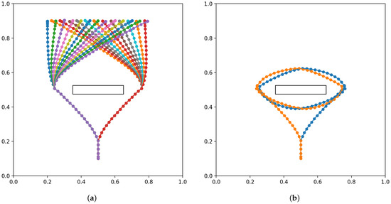 Examples of ill-posed goal-directed planning. (a) Generation of a short path reaching the goal (39 time steps) and (b) an alternative long path to the same goal (44 time steps).