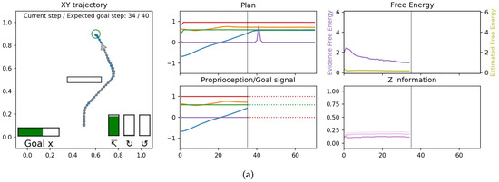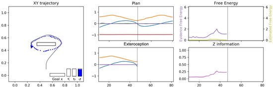 Figure 10 shows three examples of plans generated and then executed for three goal categories. The visualization is split into three panels, with the left panel showing the planned and actual agent trajectories, the middle panel showing the sequence of proprioceptive-exteroceptive states in the planned trajectory at the top, while the bottom shows the history of sensory inputs and preferred goals. Finally the right panel shows mean evidence free energy for the past window and the mean expected free energy in the future window at the top, while z information is shown in the bottom. z information represents the effectiveness of the probabilistic latent variables in each layer. This value is computed by where N is the unit normal distribution, which considers that the approximate posterior probabilistic distribution with the unit normal distribution should have no effect, other than potentially as a source of random noise.