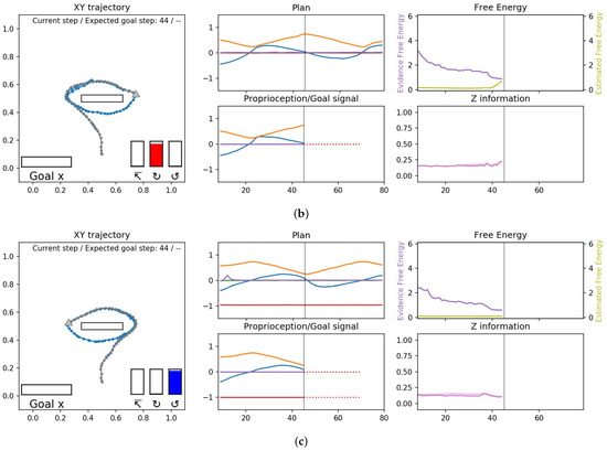 Until the observed trajectories are mostly indistinguishable from the reaching trajectories, of which the occurrence probability was learned as high in the prior distribution, the network infers goal-reaching as the default goal from these observations. While the observed movement trajectory begins to enter a cyclic trajectory after , it still takes some time for the network to correctly infer the ongoing goal as cyclic. During this time, free energy increases, an example of which is shown in Figure 14. This is analogous to a ‘surprising’ observation. After some time, the goals are inferred correctly as the cycling goals as shown in Figure 13c,f for the counter-clockwise and clockwise cases, respectively. The free energy is reduced accordingly at this moment, as also shown in Figure 14, which shows a generated plan, the plan free energy, and z information in the counter-clockwise case. We note that the the effectiveness of the probabilistic latent variables (z information) also rises and stays elevated to contribute to producing the correct inference of possible goals.