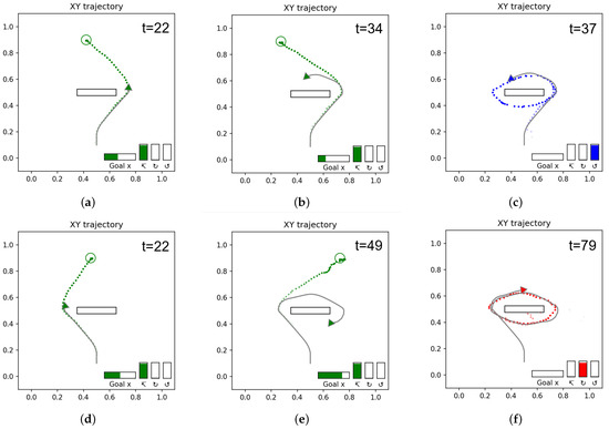 Figure 12 shows the anticipated trajectories and goals at different points in time as the network observed the goal-reaching trajectories in Figure 11a,b.