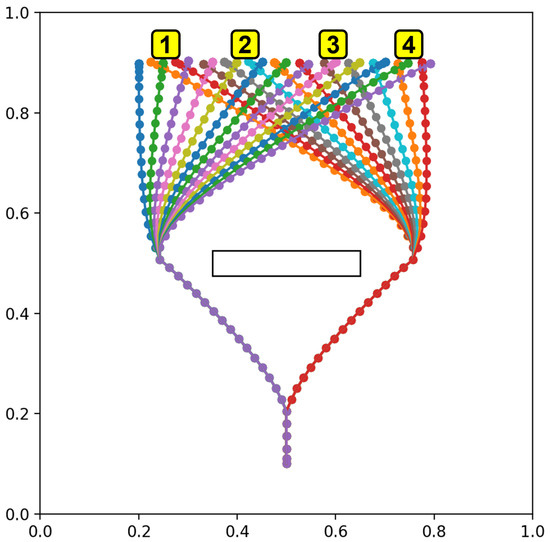 To evaluate the effect of adding the constraint for travel time minimization, we prepared three separately trained networks and four untrained goal positions that are shown with numbers overlaid on the training trajectories in Figure 16. The goal positions are selected to avoid the edges (lack of training trajectories) and the center (no difference in trajectory length).