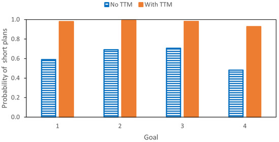 The probability of generating shorter plans for different test goal positions with and without adding the travel time minimization (TTM) constraint.