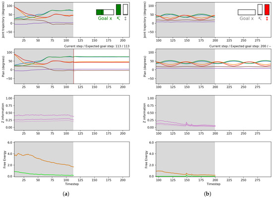 Plots generated while the robot is executing the goal-directed plan. Top to bottom: the sensorimotor history for each robot joint (goal inset on the top right, enlarged for visibility), current planned trajectory for each robot joint, z information, and free energy (dark orange: evidence FE, light green: expected FE). Note that only a selected number of joint angles are shown for clarity. (a) An example of grasping-placing, as it reaches the distal step (red line), and (b) an example of grasping-swinging, which can cycle indefinitely.