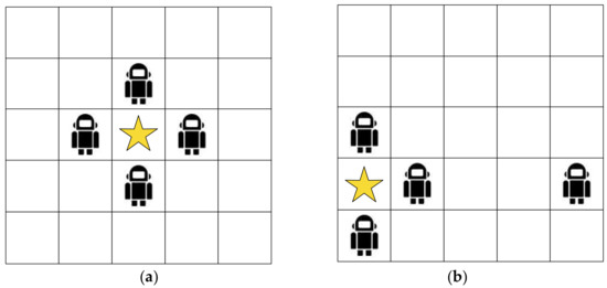 The Pursuit task: the star stands for the prey and the robots stand for predators. Subgraph (a) shows four predators block a prey successfully. Additionally, the state of subgraph (b) is equivalent to the left, since the grid world is torus. The star stands for the prey.