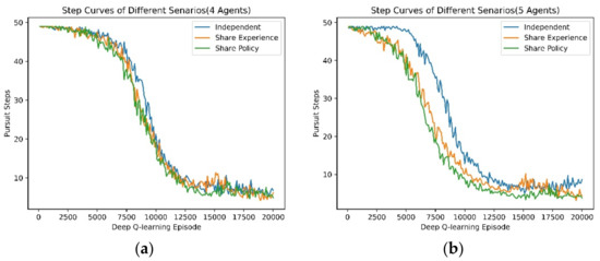 Figure 8. It is demonstrated that experience sharing can speed up the training procedure of MARL in cooperative tasks and decrease the rise time. Additionally, the curves obtain stable cooperative policies during 10,000–12,000 episodes. Additionally, the dip and vibrations at 15,000 episodes are caused by the overfitting of every random map. To suit for certain tasks or states, policy networks begin to overfit the training experience, which leads to declines in universality and scalability.