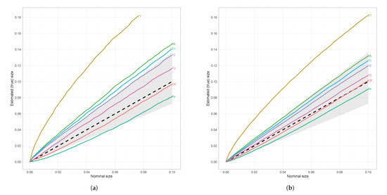 where and is the estimated (true) size. The estimated (true) size is considered to be close to the nominal size if (19) is satisfied with . Note that in this situation the estimated (true) size is close to the nominal one if and is presented in Table 1 and Table 2 in bold. This criterion has been used previously among others by [27,31].